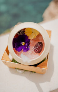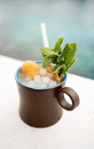 Ron especiado casero, fruta de la pasión, zumo de lima, menta fresca y agua de coco.